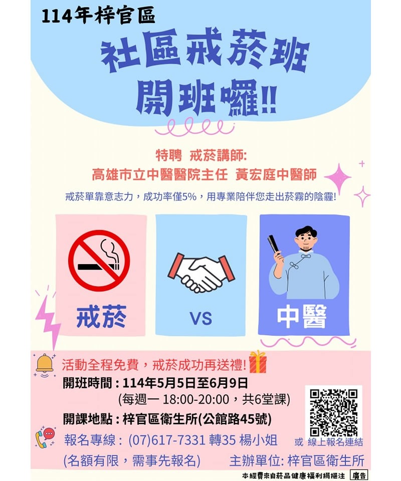 因113年12月前就已經承諾梓官區衛生所做戒菸講座原訂週一的夜間門診,調動到週一上午門診自114/5/5,至114/6/9,連續六個週一的上午+下午門診,有黃宏庭醫師的門診喔!6/16之後恢復為下午+夜間門診另,因梓官區講座路途遙遠,下午診會提早結束喔!請各位好友留意#戒菸成功 #說戒就戒 #絕不遲疑